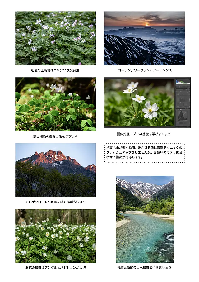 アウトドアでは素晴らしい風景と出会うことが沢山あります。山頂からの遠望、一瞬の空模様、楚々として咲く登山道の花、カメラを持っていたら、上手に撮影する技術を持っていたら、その一瞬の感動を残すことができます。この講習会ではレンズ交換タイプの一眼レフやミラーレス機のカメラの知識と、季節ごとの山岳風景に合わせた写真撮影のヒントをお伝えします。5月〜7月は「新緑とお花を撮る」をテーマに、モンベル渋谷店で全4回の店内講習を行います。1回だけのご参加もOKです。お使いのカメラをご持参ください。